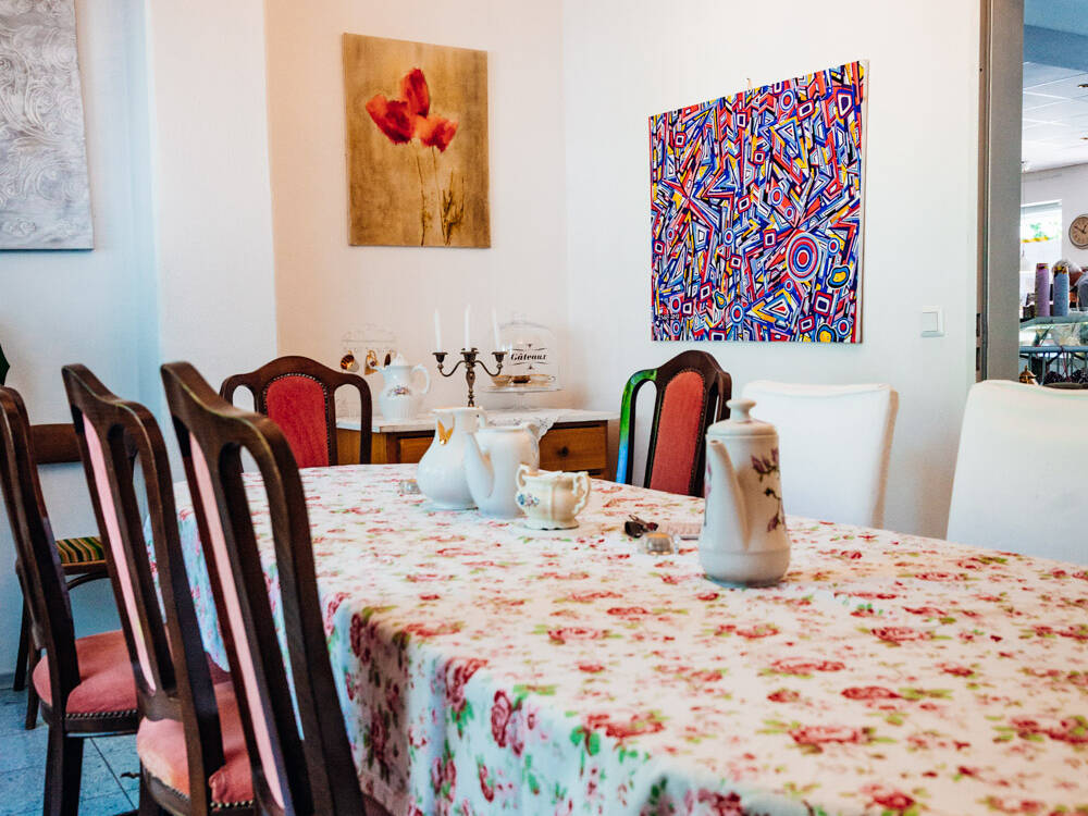 Neben zwei Terrassen, einem Nebenraum (für bis zu 12 Personen) sowie einem Spielzimmer für unsere kleinen Gäste, ist es ein Ort, der mit seinem herzlichen Service zum Wohlfühlen, Abschalten und Relaxen einlädt. Genießen Sie unsere feinen Kuchen und leckeren Eiskreationen unseres Konditormeisters, sowie Kaffeespezialitäten oder auch eine unserer vielfältigen Frühstücksvariationen mit hausgemachten Konfitüren. Außerdem bieten wir Pralinen vom Confiseur, Kuchen zum Mitnehmen und Torten für besondere Anlässe ganz nach Ihren Wünschen.